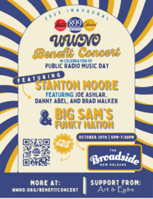 Join WWNO for an inaugural benefit concert in celebration of Public Radio Music Day on Wednesday, October 29th from 5:00 to 7:30pm at the Broadside! Bring your family, dancing shoes and get ready to boogie to the sounds of Stanton Moore Featuring Joe Ashlar, Danny Abel and Brad Walker and Big Sam's Funky Nation and connect with WWNO hosts and staff as well as the community of like-minded supporters who love public radio!